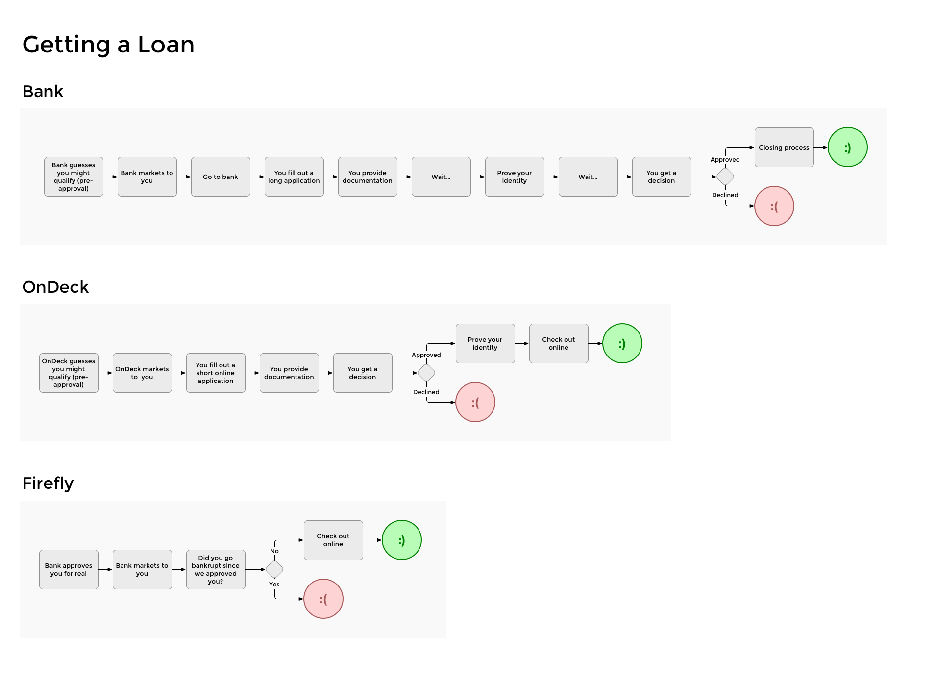 This diagram was made early in the process to clarify the overall process for team members and stakeholders . It also nicely illustrated how much faster and simpler the Firefly process would be.